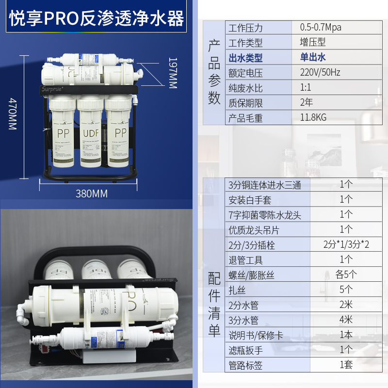 接头盒管路使用量,降低漏水风险。净水器不需要压力桶,并且电控稳定,大流量家用净水