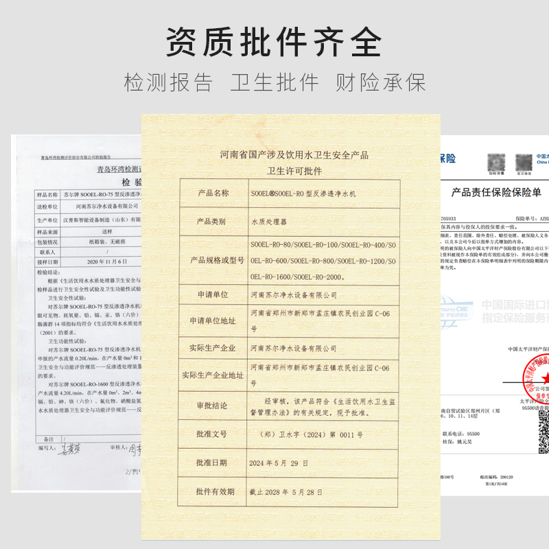 苏尔净水器检测报告、涉水卫生批件、水效、保险所有手续齐全,欢迎广大用户放心选择使用。
