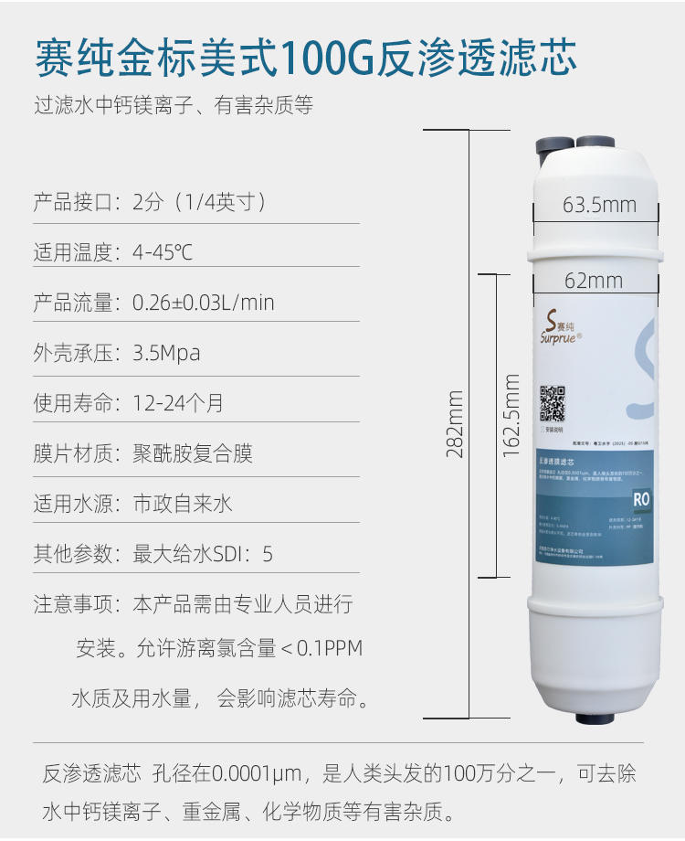 赛纯滤芯全部采用金级标准,快接RO膜100G通量,100加仑制水速度快,原装世韩节水膜片卷制,高脱盐、