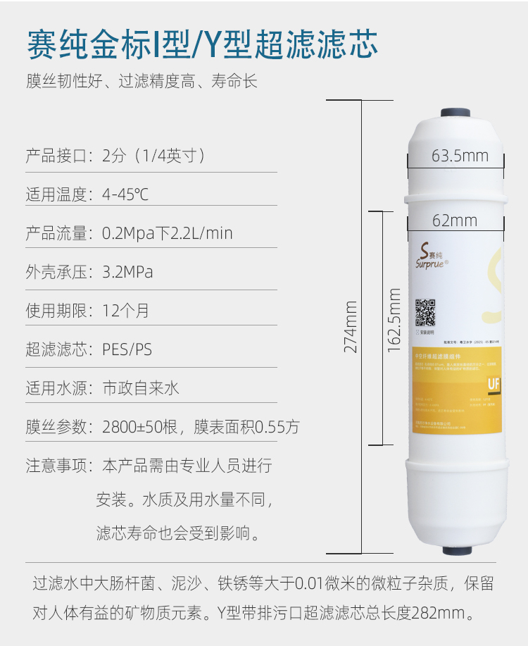 外压超滤膜。赛纯滤芯全部采用金级标准,滤芯全部是金标设计,超滤采用飓风PS材质、化学成孔、孔