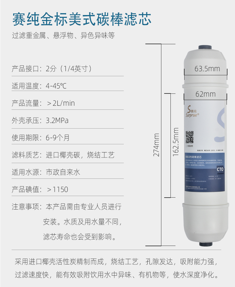 赛纯滤芯全部采用金级标准,滤芯全部是金标设计,活性炭滤料采用进口高碘值椰壳活性炭,酸洗工艺,