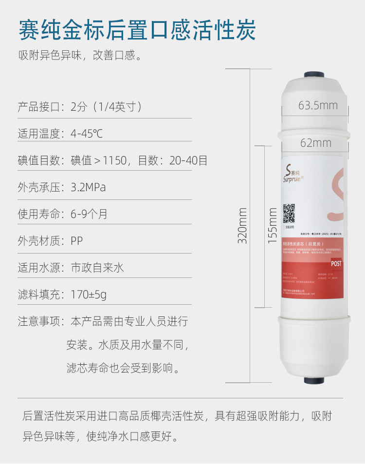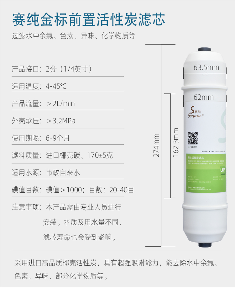 赛纯滤芯全部采用金级标准,滤芯全部是金标设计,活性炭滤料采用进口高碘值椰壳活性炭,酸洗工艺,