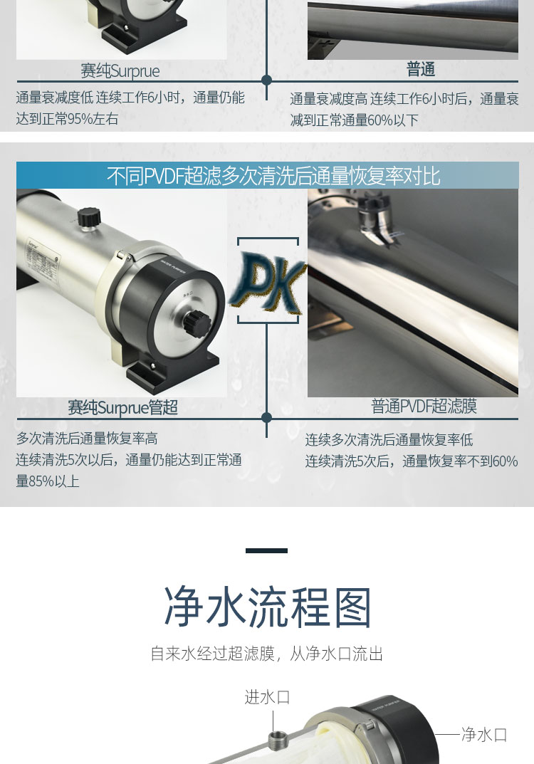 Surprue赛纯不锈钢管道超滤的优势:1、PVDF材质UF膜丝任性强、易清洗、寿命长。2、亲水性好,传统