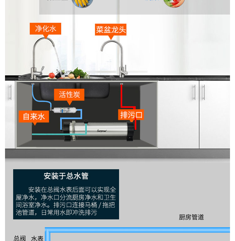 Surprue赛纯管超1吨规格的进水口、排污口、净水口都是4分螺纹接口;3吨通量规格的管道超滤进水口、