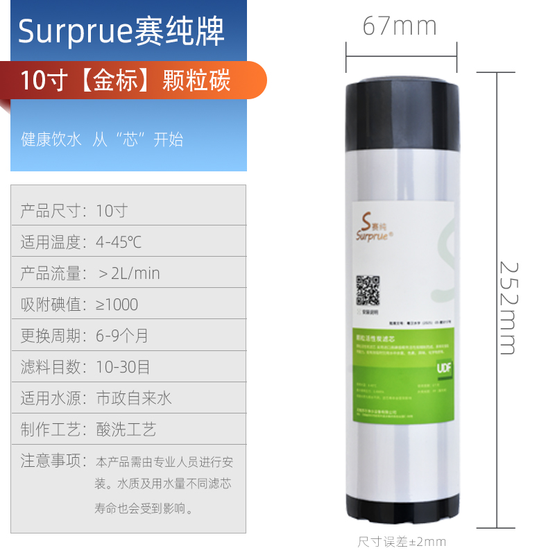 Surprue赛纯金标前置颗粒碳滤芯采用进口高碘值椰壳活性炭精制而成,具有较强吸附能力,能有效吸附饮用水中余氯、色素、异味、化学物质等。