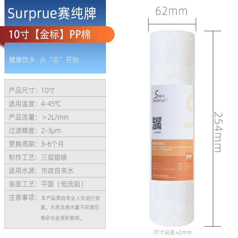 Surprue赛纯10寸20寸平口通用滤芯金标金级聚丙烯前置沉淀滤芯聚丙...