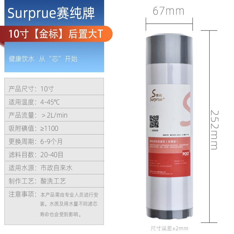 Surprue赛纯10寸通用金级后置颗粒碳滤芯采用椰壳活性炭酸洗工艺黑...