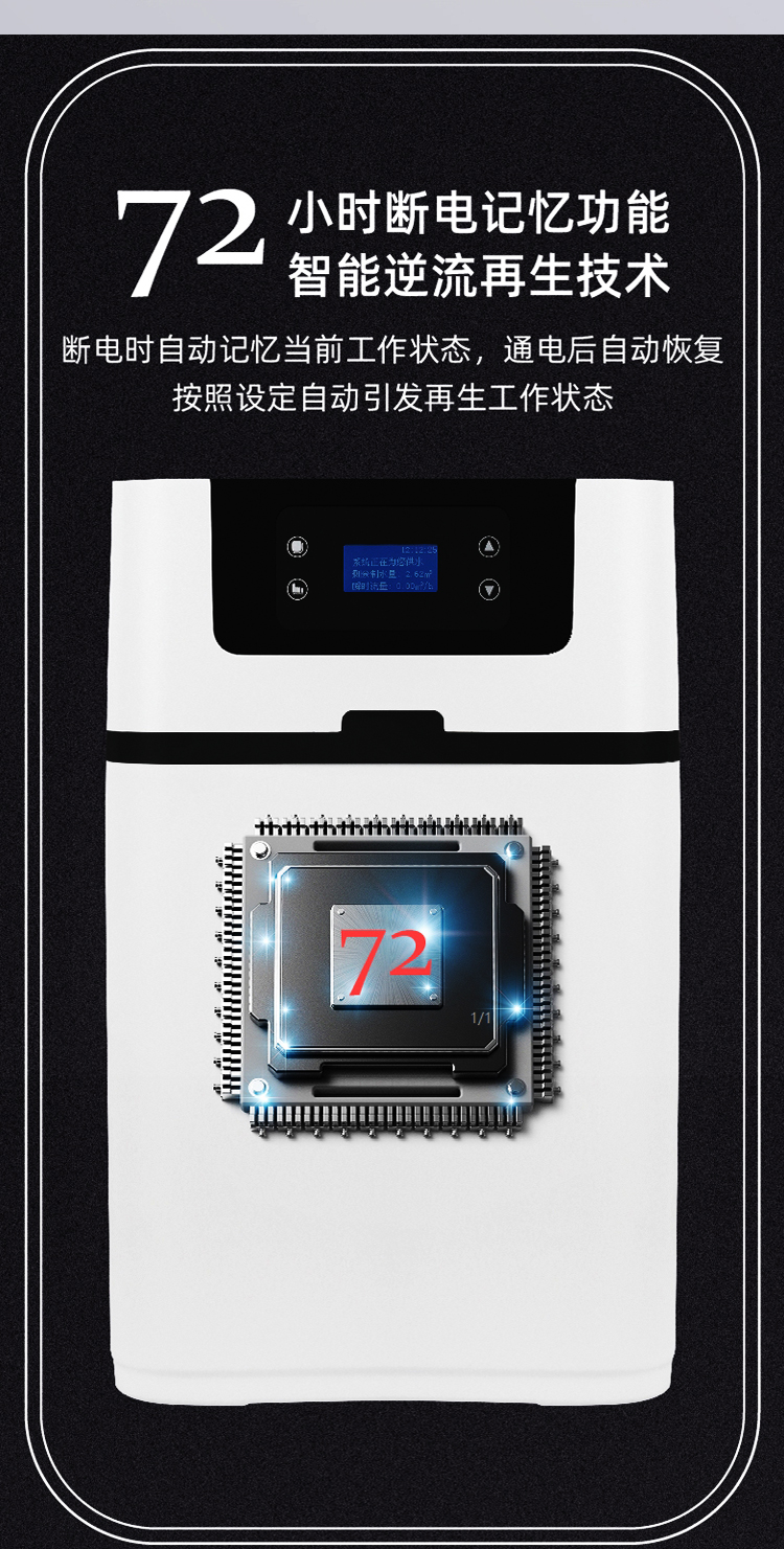 断电记忆、大容量低盐耗、使用寿命长、集成一体阀等诸多优点。控制阀类型:串联软化阀,再生模式:时间