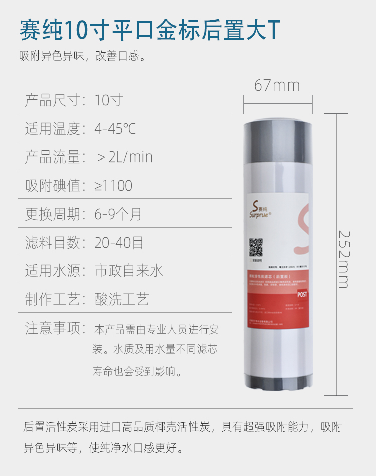 Surprue赛纯滤芯:家用净水器通用滤芯,10寸后置大T33滤芯,后置活性炭滤芯,家用净水器后背五瓶净水器使用