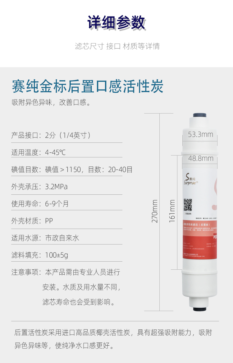 Surprue赛纯滤芯:家用净水器通用滤芯,8寸一体快接后置颗粒碳滤芯,UDF滤芯,快接口感