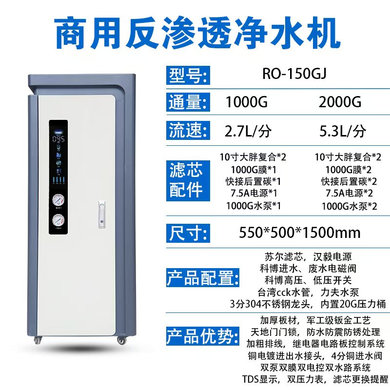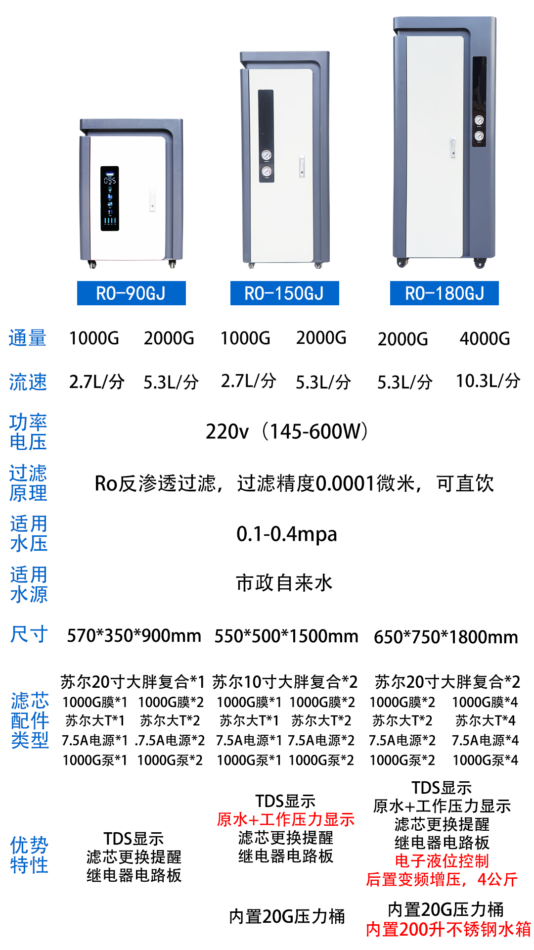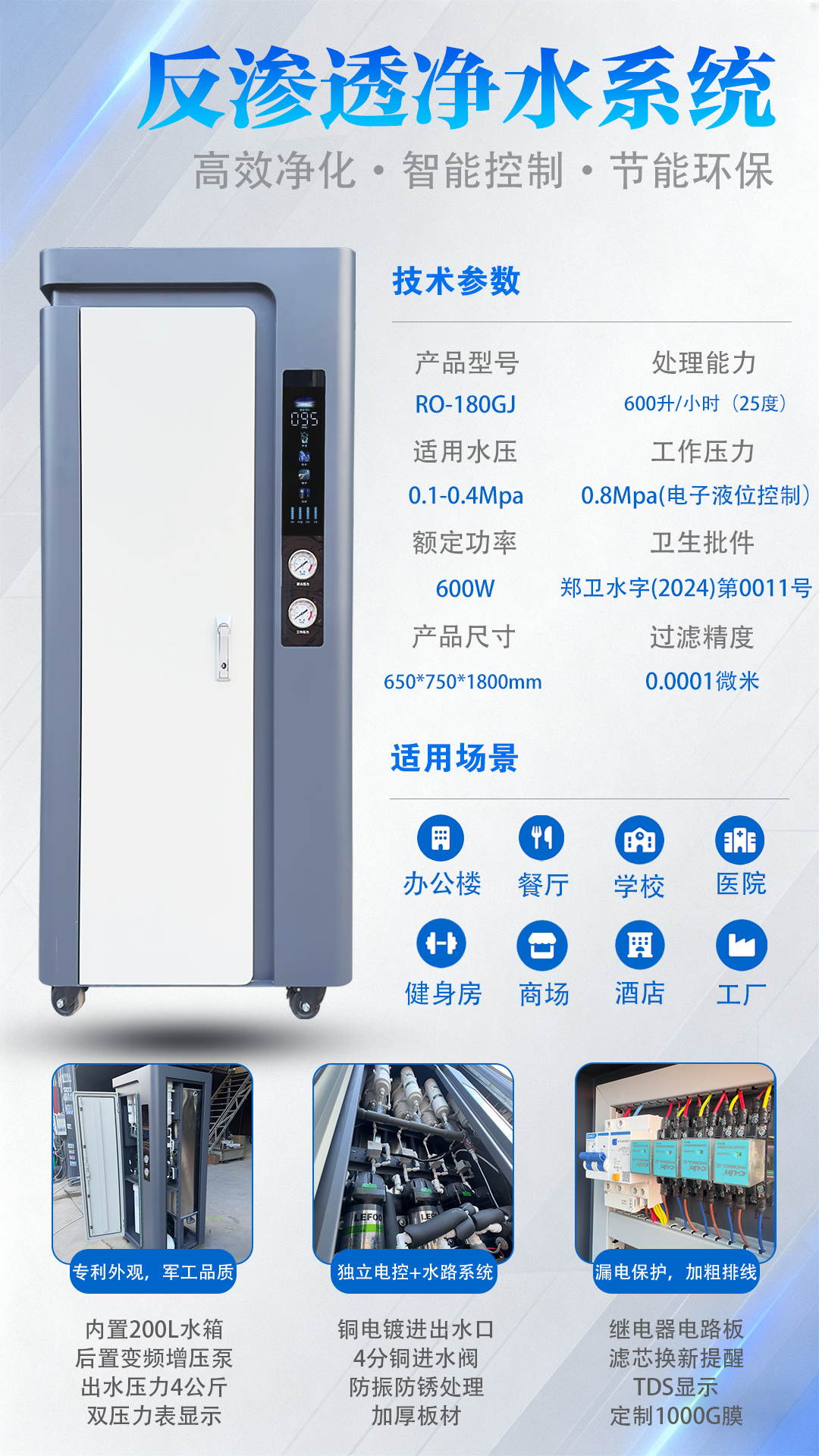 办公楼、餐厅、学校、医院、健身房、商场、酒店、工厂等场景。RO-180GJ型号内置200L水箱,后置