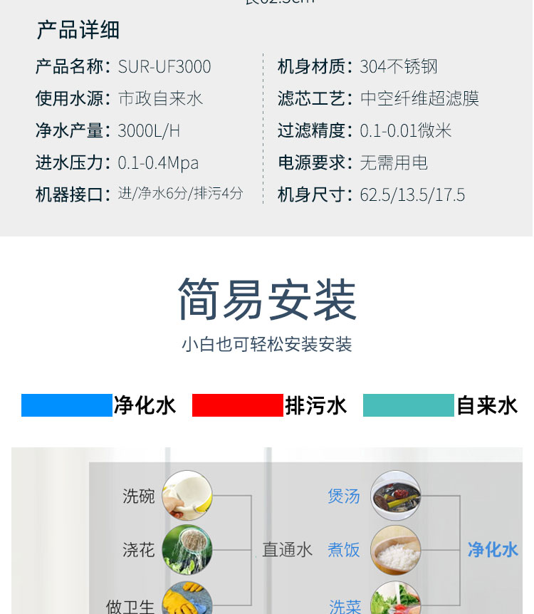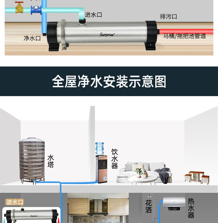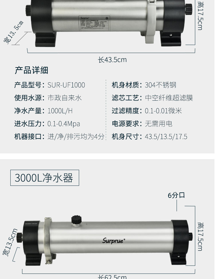 Surprue赛纯管超1吨规格的进水口、排污口、净水口都是4分螺纹接口;3吨通量规格的管道超滤进水口、