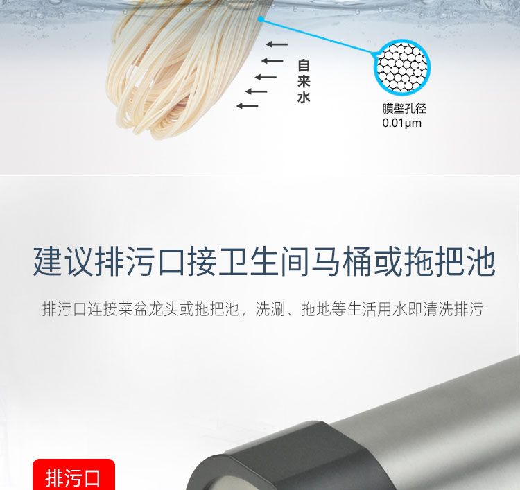 净水口都是6分螺纹口,排污口是4分螺纹口。安装建议:建议排污口连接冲水马桶、拖把池等,这样就不用专