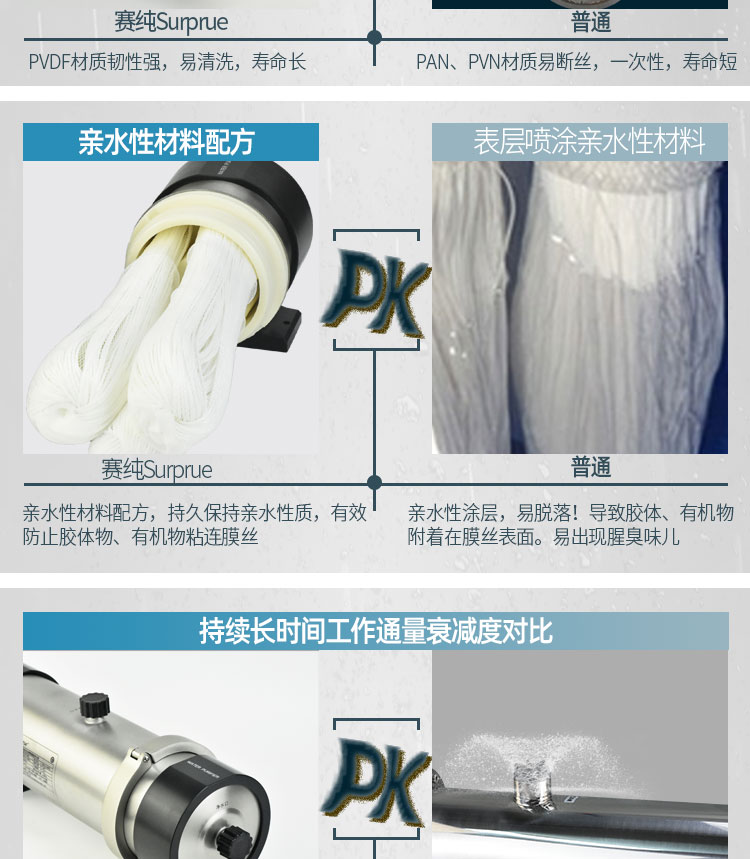 丝表面,不容易清洗导致清洗后的通量恢复率较低。Surprue赛纯膜丝配方加入了亲水性设计,亲水性更持久